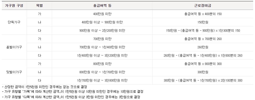 가구의 형태 및 급여액을 따져보시고 본인이 얼마를 받으실 수 있으실지 미리 계산 해 보세요. 근로장려금 지급액 산정은 아래 링크에서도 해보실 수 있습니다.