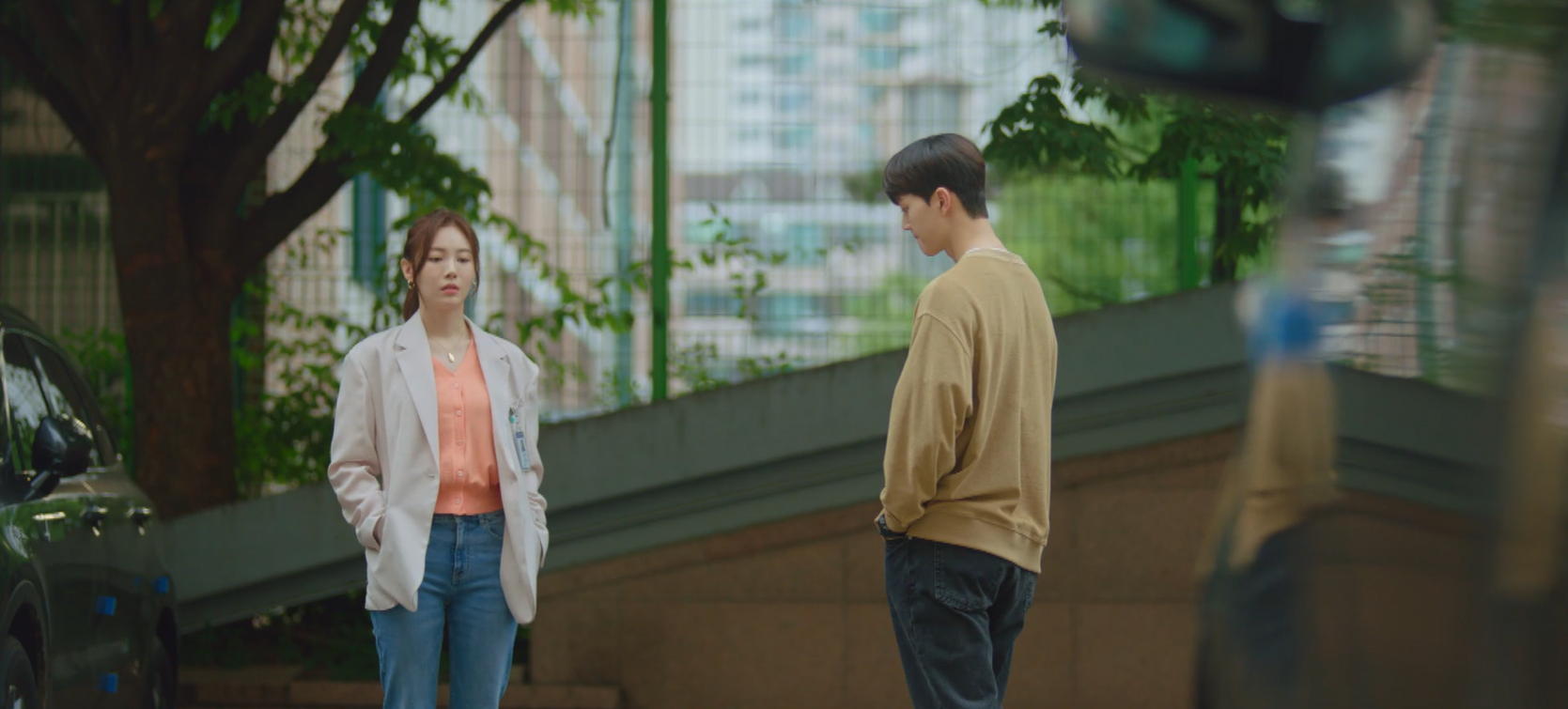 출근을 하던 진하경은 기상청 출입문에서 경비와 실랑이를 하는 이시우를 목격했어요. 신분증이랑 사원증이 없어 들어가지 못하고 있는 모습이었죠.