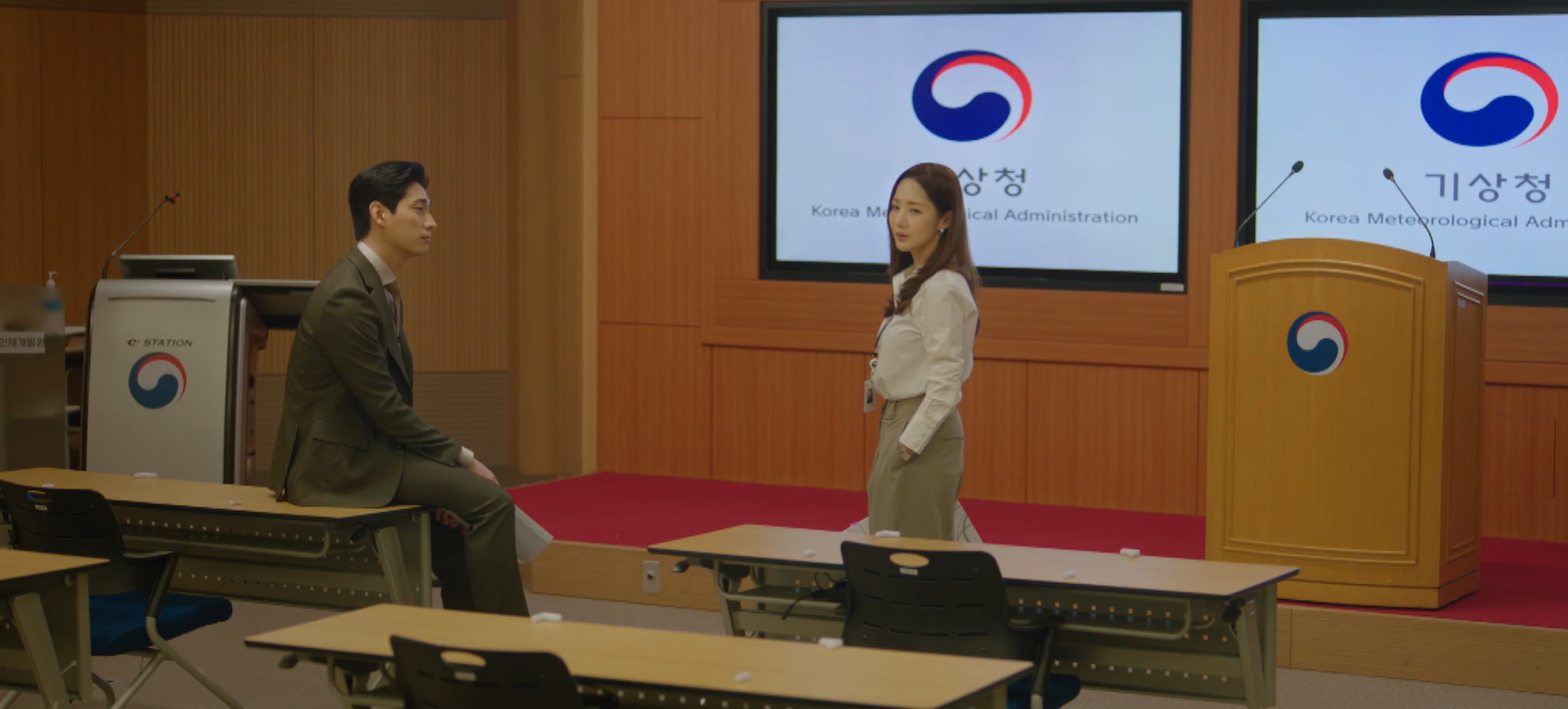 진하경이 이시우가 기상청 사람이 맞다고 확인을 해주고 나서야 이시우는 기상청에 들어갈 수 있었어요. 이시우가 진하경이 있는 총괄2팀으로 파견을 나오게 된 것이었죠. 두 사람은 그렇게 재회하게 되었습니다.