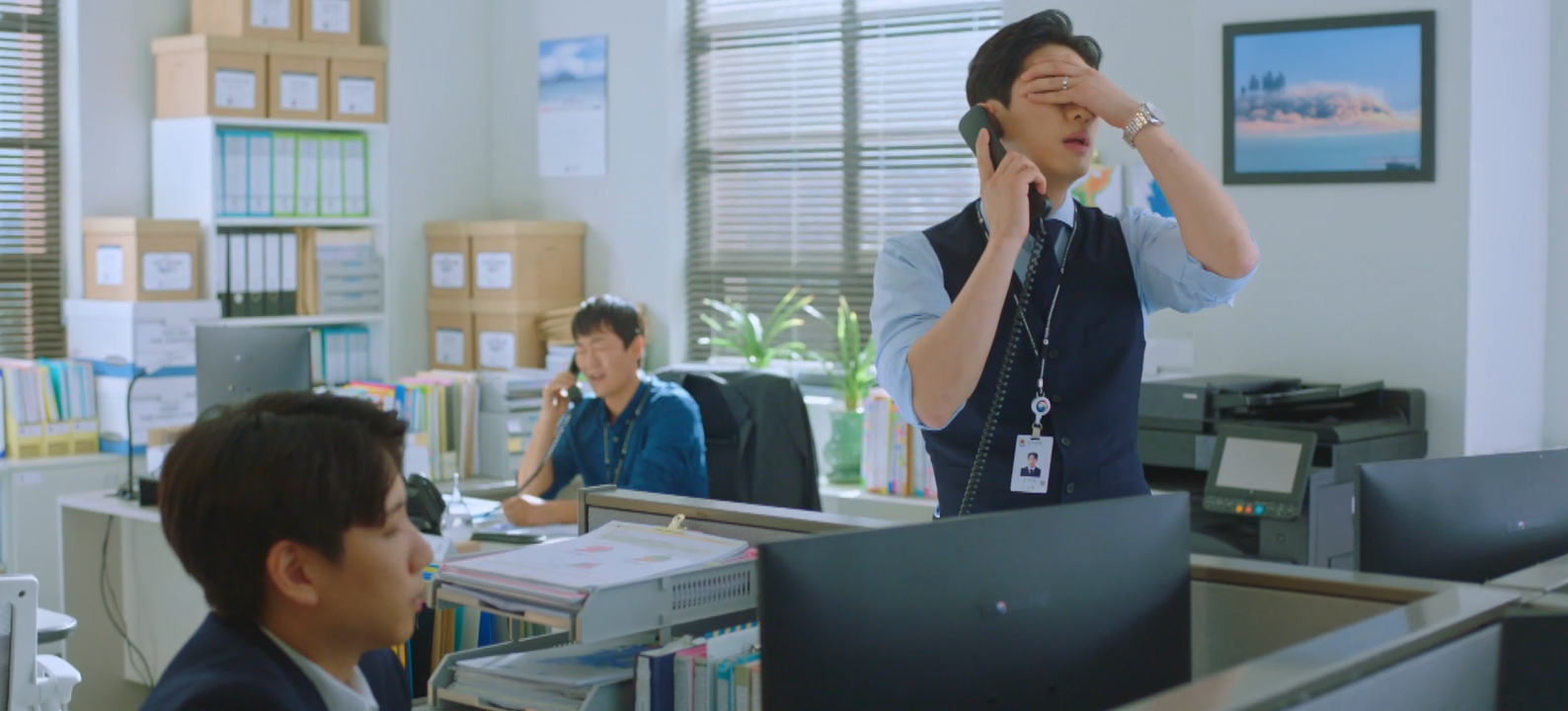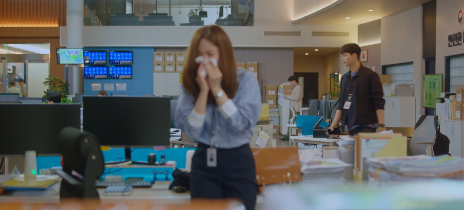 풍랑경보때문에 한기준이 있는 대변인실은 난리가 난 것 같았어요. 어부들의 항의전화로 업무가 마비상태였죠. 한기준은 진하경을 찾아가서는 예비특보라도 내려달라고 했어요. 그럴 수 없다는 진하경에게 할 수 있는데 개인적인 감정때문에 이러고 있는 거 아니냐며 따졌죠.