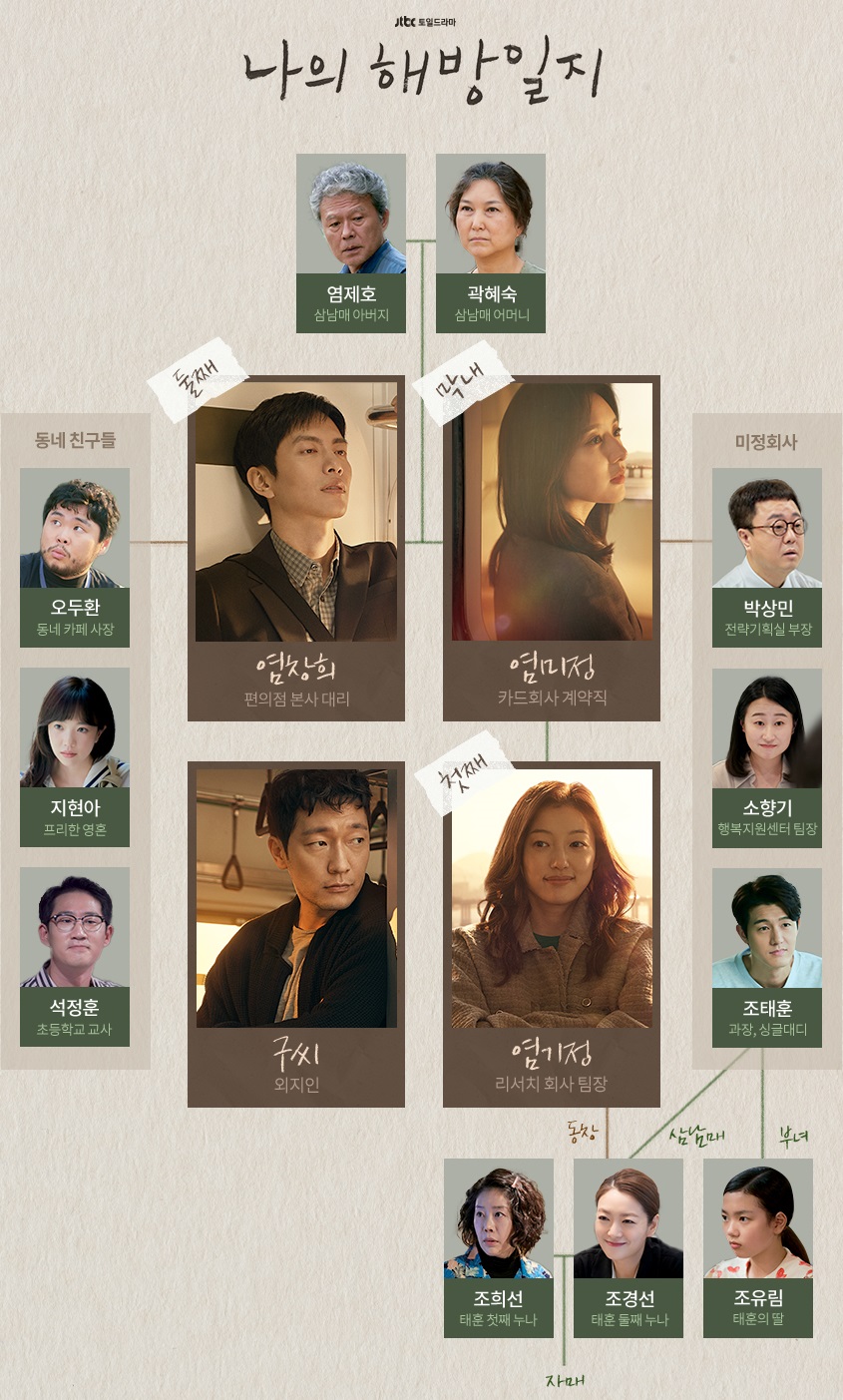나의 해방일지 인물관계도 입니다. 염씨 삼남매를 중심으로 이야기가 돌아가게 되는 것 같은데요. 서로 다른 세 사람이 어떻게 인생에서 해방될지 어떻게 다른 해방일지를 그려나갈지 기대되는 것 같습니다. 특히 이름도 없이 구씨 라는 역할을 맡게된 손석구 배우가 어떤 역할을 할지도 기대되네요.