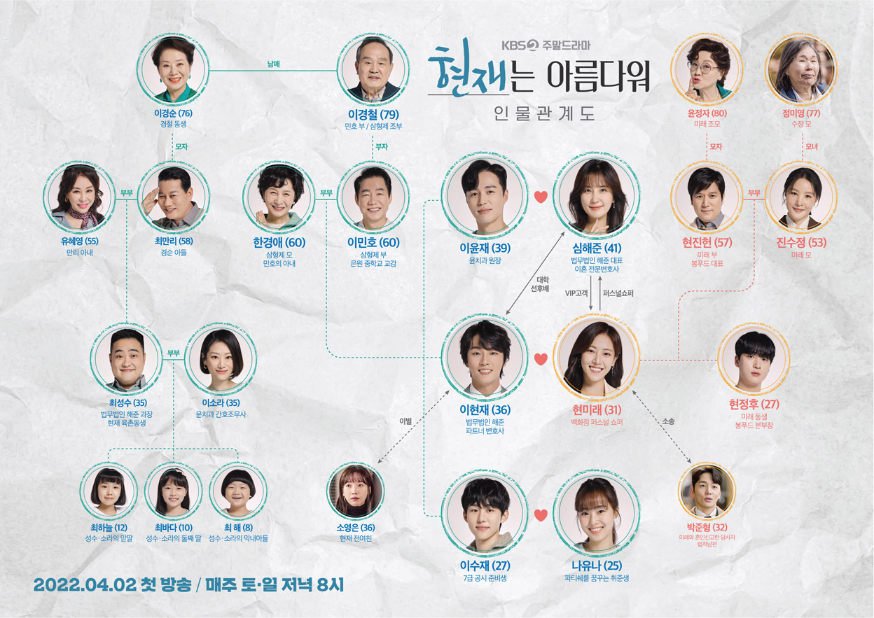 드라마 현재는 아름다워는 신사와 아가씨 후속으로 방영되는 KBS2 주말드라마로 2022년 4월 2일 첫방송 됩니다. 매주 토요일, 일요일 저녁 8시에 KBS 2TV에서 방영됩니다.
