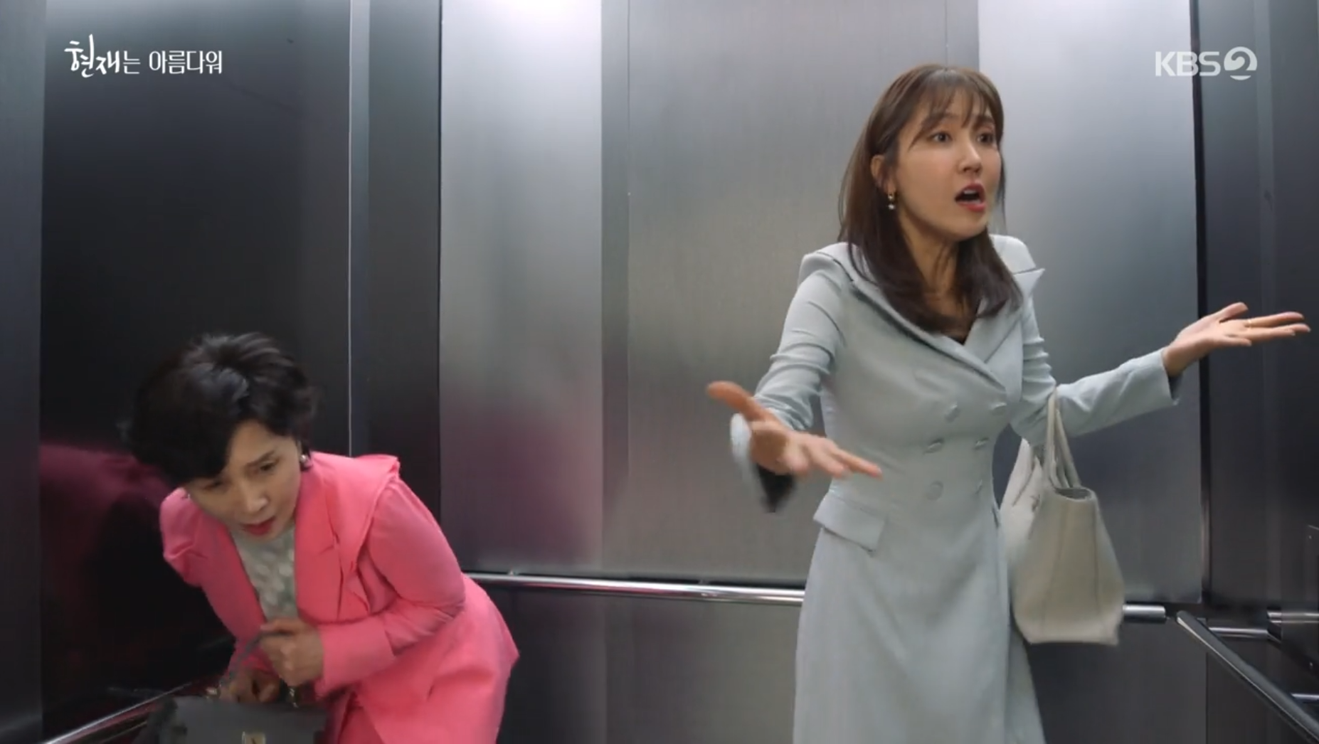 이현재를 만나러 가던 한경애는 엘리베이터에서 심해준을 마주쳤어요. 심해준은 이윤재와의 일을 생각하며 자기도 모르게 혼자 엘리베이터에서 분노를 표출했죠. 그 모습을 보고 너무 놀란 한경애는 이상한 여자다 생각했죠. 한경애가 로펌에 간다는 말에 자기가 로펌 대표인 것을 알면 개망신을 당할까봐 자기는 로펌 직원이 아니라고 하고는 줄행랑 치는 심해준이었습니다.